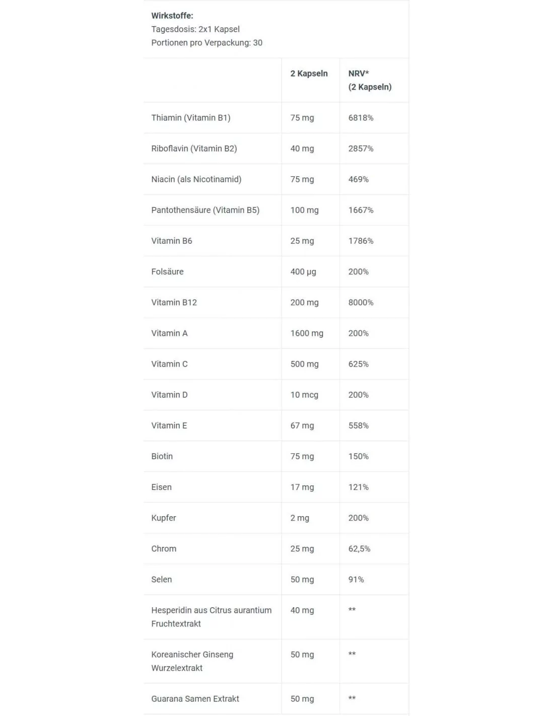 Charges (cellulose microcristalline, hydroxypropylméthylcellulose), acide L-ascorbique, acétate de DL-α-tocophéryle, D-pantothénate de calcium, extrait de citron aurantium, mononitrate de thiamine, agent d'enrobage [stabilisant (hydroxypropylméthylcellulose), colorant (oxyde de fer), nicotinamide, agent de démoulage (sels de magnésium d'acides gras), pollen d'abeille de fumarate ferreux, extrait de racine de panax ginseng, extrait de graine de guarana, riboflavine, chlorhydrate de pyridoxine, poudre de racine de valériane, poudre de racine de réglisse, sulfate de cuivre, cholécalciférol, acétate de rétinyle, acide folique, cyanocobalamine, chrome III Chlorure, sélénite de sodium, biotine.